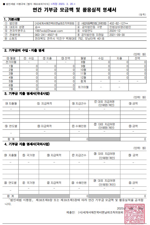 2024년 연간 기부금 모금액 및 활용실적 명세서 관리자2025-08-20조회 12653 목록 이전글 2025세계서예전북비엔날레 개막식 및 부대행사 운영 용역 재공고 다음글 2026 찾아가는 한글서예교육 전문 인력 양성 프로그램 수강생 모집(수정)